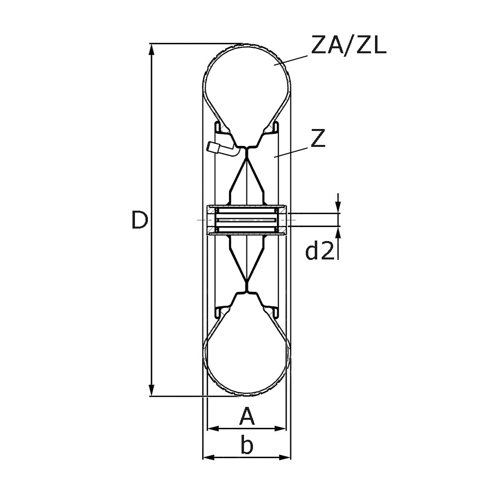 A=Naaflengte, b=Bandbreedte in mm, D=Ø-Wiel in mm, d2=Ø-asgat, K=Max. statisch draagvermogen in kg bij 10 km/h, Type=Lagertype, Uitv.=Profiel band, Z=Velgmaat (Ø x breedte), ZA=Bandenmaat in Inch