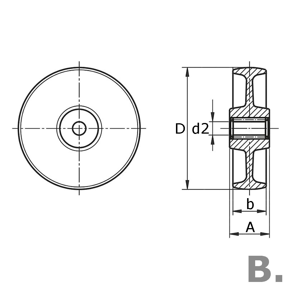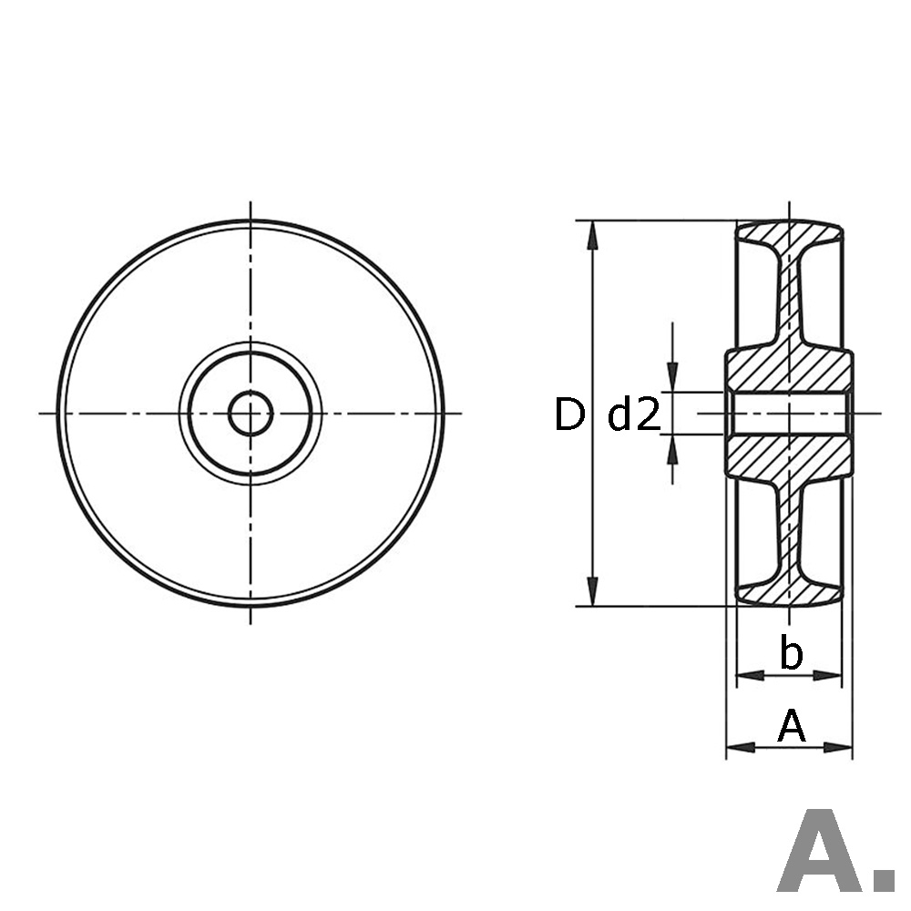 A=Naafbreedte, b=Breedte loopvlak, D=Ø-Wiel, d2=Ø-asgat, K= Max. statisch draagvermogen in kg bij 4 km/h