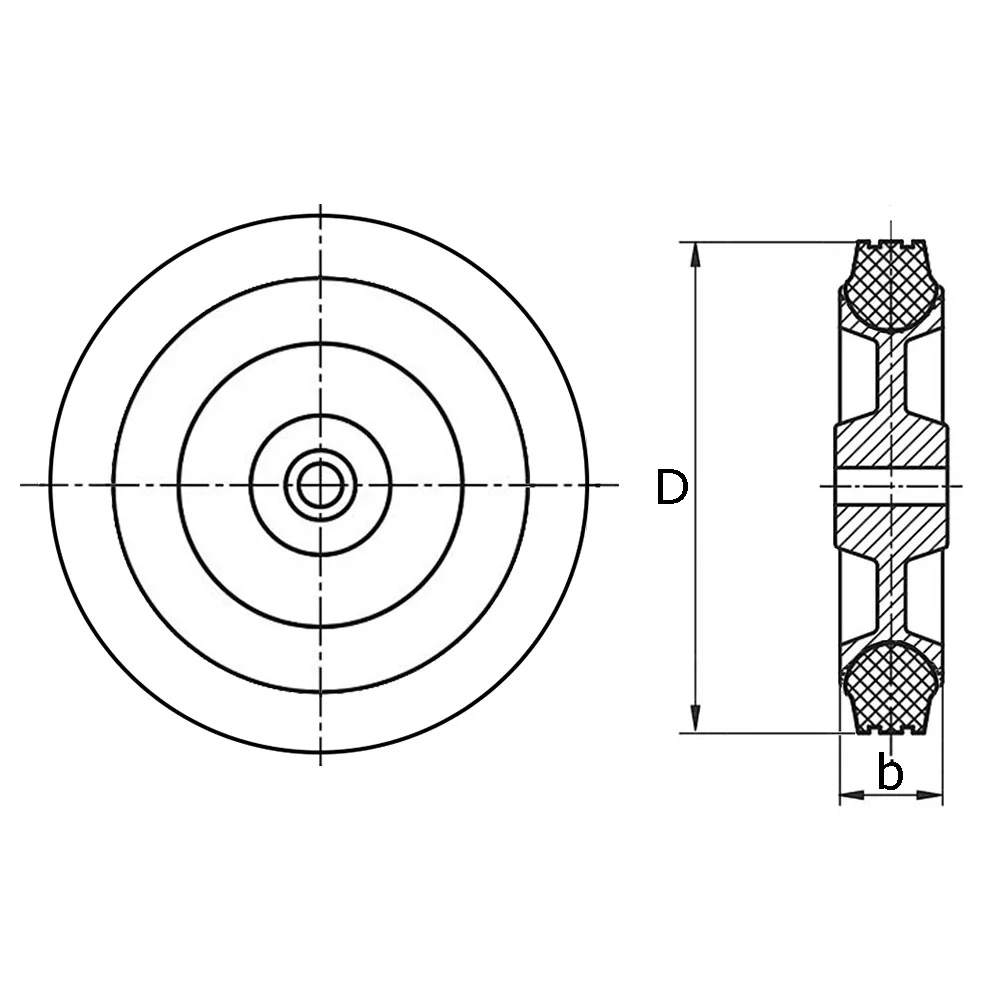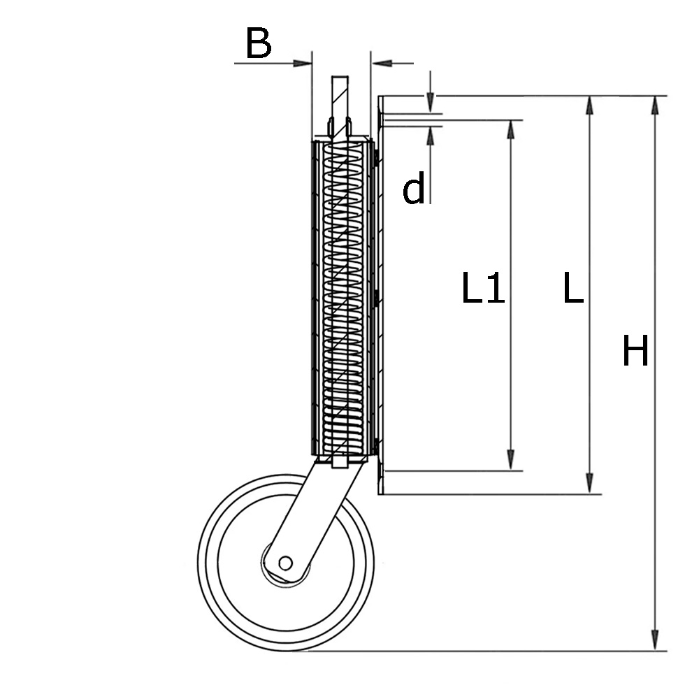B=Breedte, b=Breedte loopvlak, D=Ø-Wiel, d=Ø-boring, H=Totale hoogte, L=Lengte plaat, L1=Hartafstand boring, K=Maximaal draagvermogen wiel in kg, Type=Lagertype