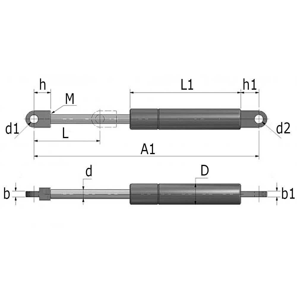A1=Installatie lengte, b=breedte, b1=breedte, D=cilinder-Ø, d=zuigerstang-Ø, d1=boring-Ø, d2=boring-Ø, h=hoogte tot hart boring, h1=hoogte tot hart boring, L=slaglengte, L1=cilinder lengte, M=schroefdraad maat, N=vuldruk in Newton, Uitv.=Progressie %