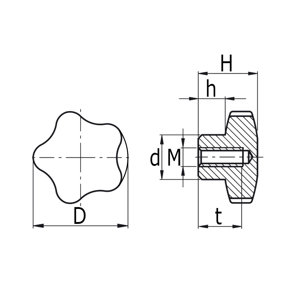 D=Knop-Ø, d=Kraag-Ø, H=Totale hoogte, h=Hoogte kraag, M=Schroefdraad