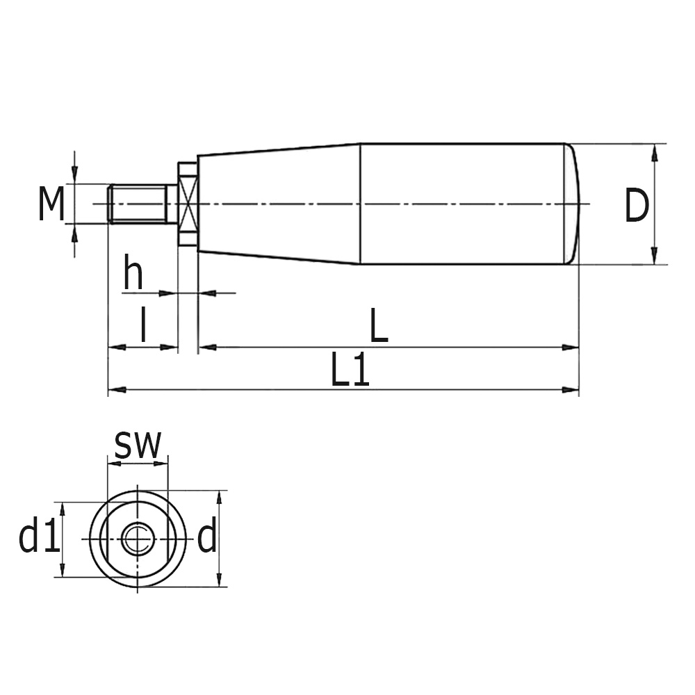 D=Greep-Ø-groot, d=Greep-Ø-klein, L=Greeplengte, L1=Totale lengte, l=Draadlengte, M=Schroefdraad, SW=Sleutelwijdte