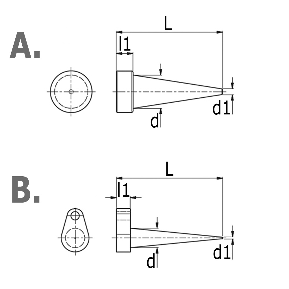 Boring=Passend in gaten met min/max Ø, D=Grote-Ø, d=Kleine-Ø, L=Totale lengte, l1=Hoogte kop