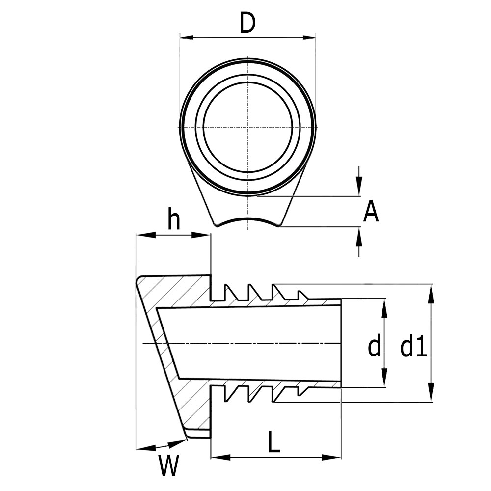 A=Afstand, Buisafmeting=Uitwendige buisafmeting, D=Voet-Ø, d=Schaft-Ø, d1=Lamellen-Ø, h=Voethoogte, L=Schaftlengte, Uitv=Wandikte buis, W=Standhoek in °