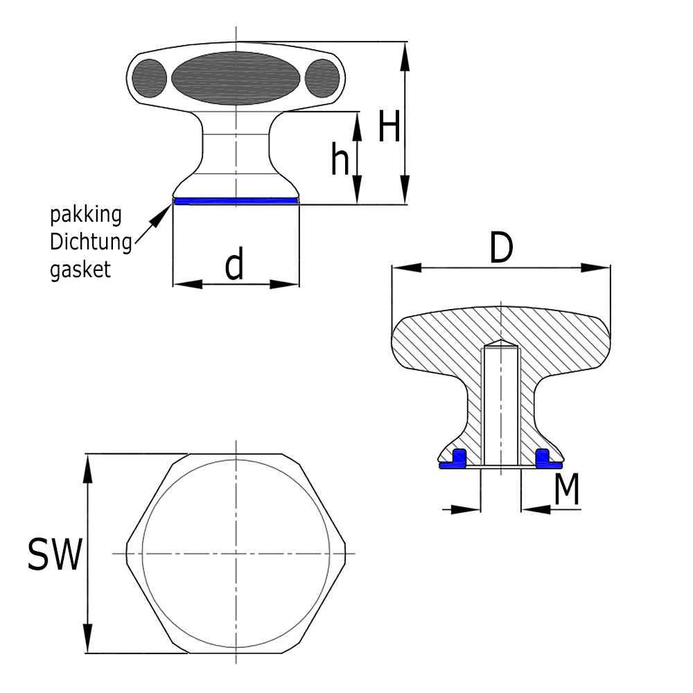 D=Ø-knop, d=Ø-montagevlak, H=Totale hoogte, h=Hoogte, M=Metrische schroefdraad, SW=Sleutelwijdte