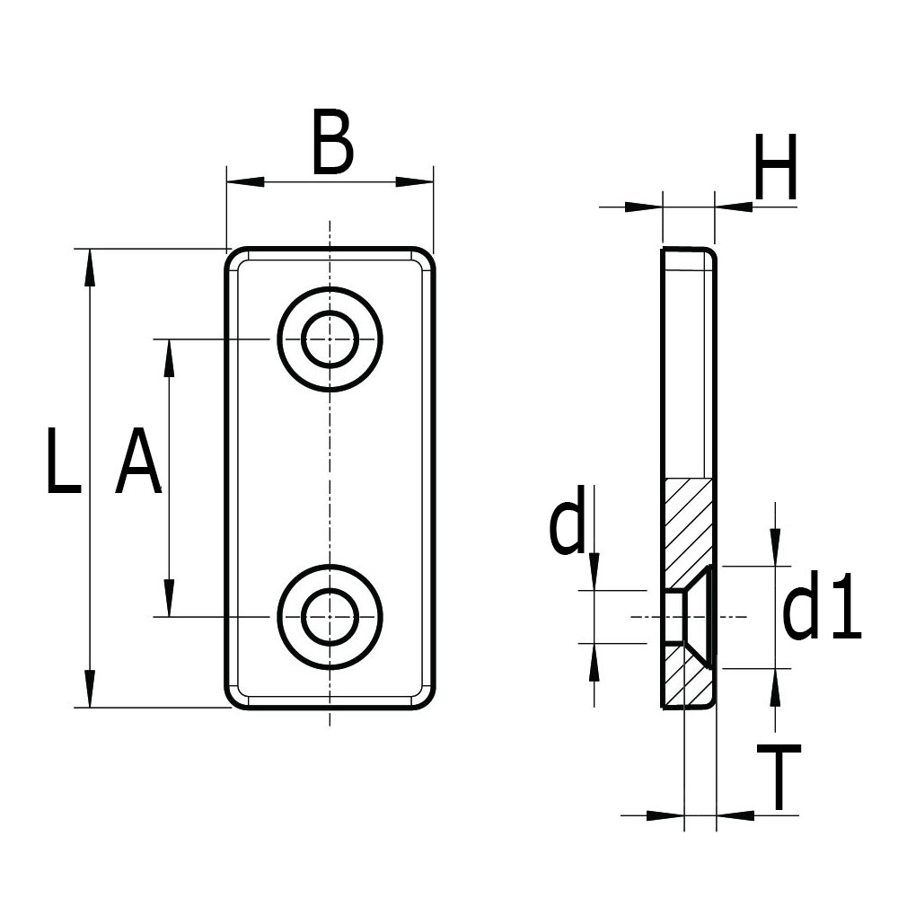 A=HOH-afstand boringen, B=Plaatbreedte, Buisafm.=Plaatmaat, d= Boring-Ø, d1= Verzonken boring-Ø, H=Plaatdikte, L=Plaatlengte, T=Diepte verzonken gat