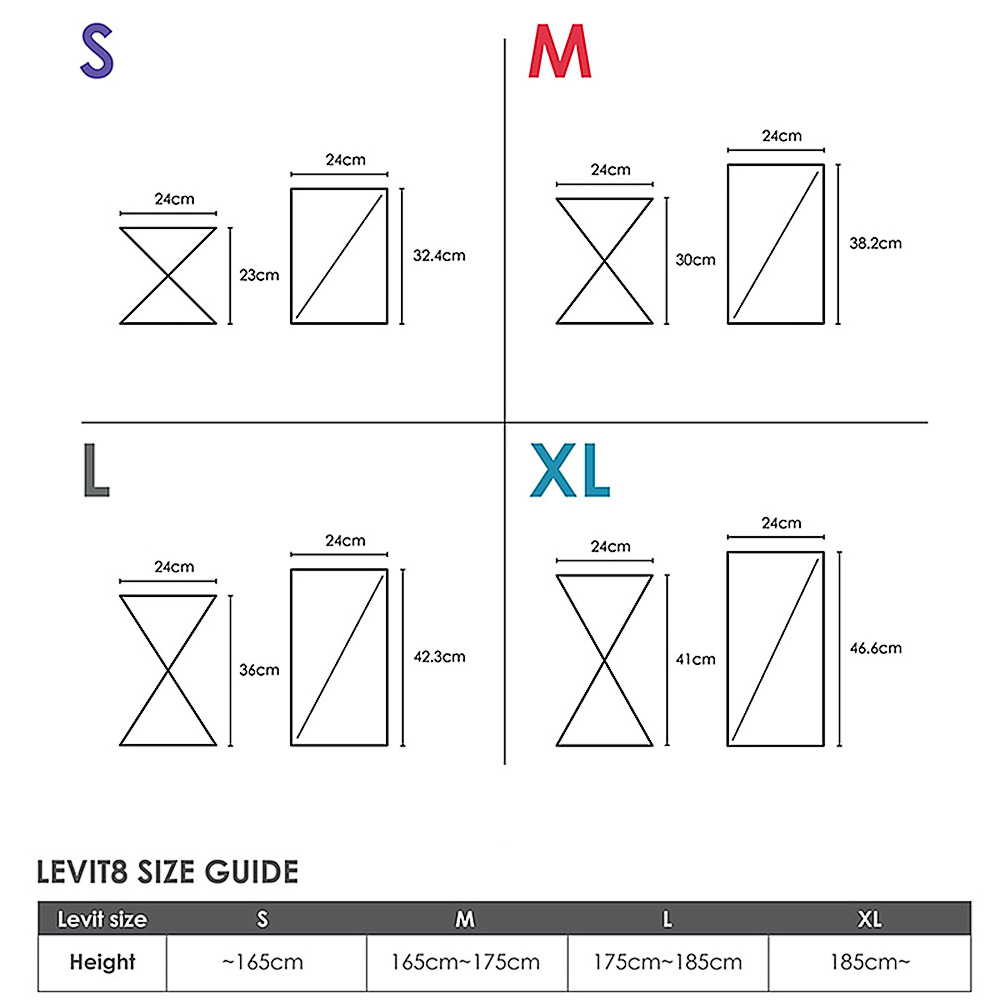 B=Breedte, H=Hoogte volledig ingeklapt, H1=Hoogte uitgevouwen/gebruiksklaar, Type=Lichaamslengte gebruiker, Uitv.=Maat