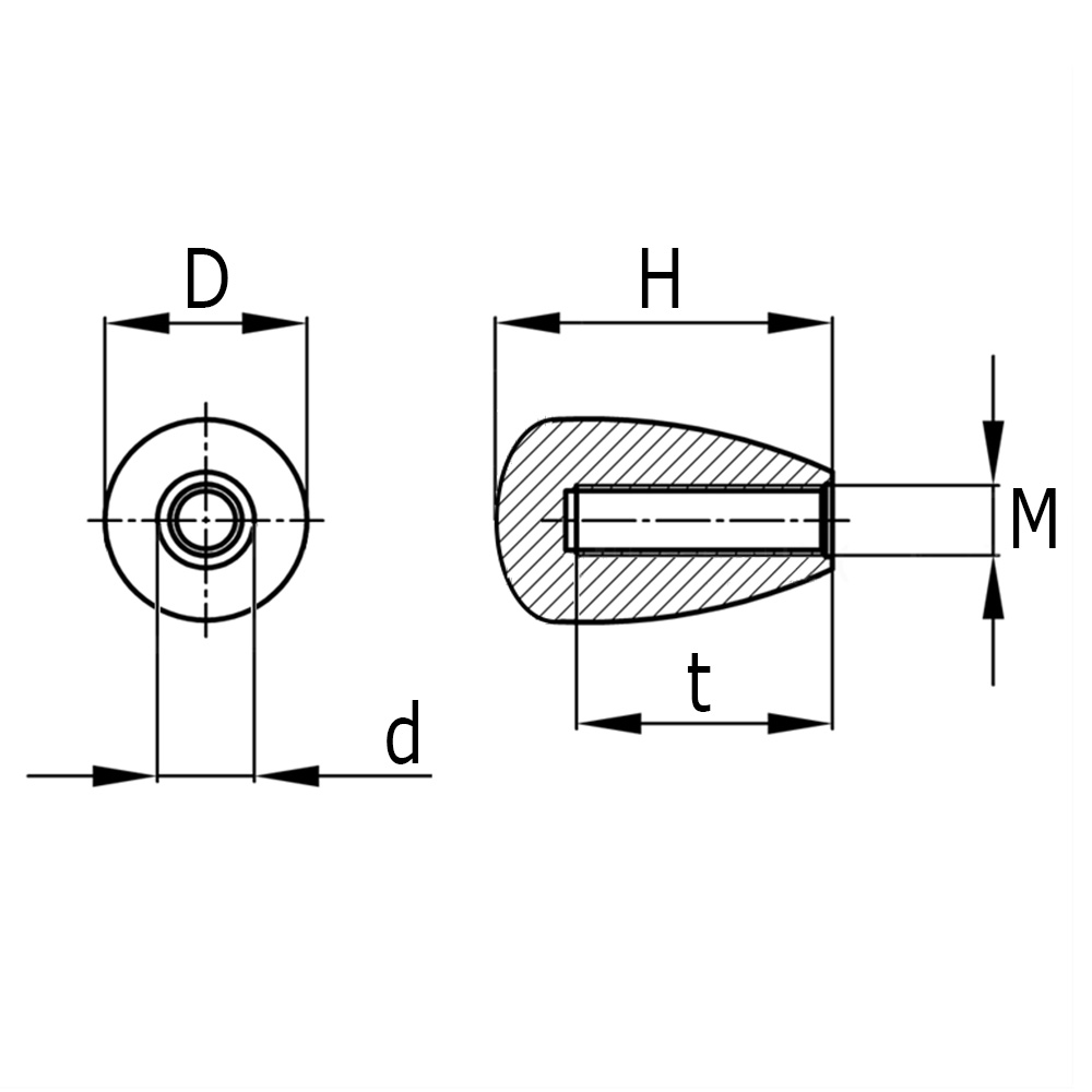 D=Knop-Ø, H=Knop hoogte, M=Schroefdraad, t=Schroefdraad diepte