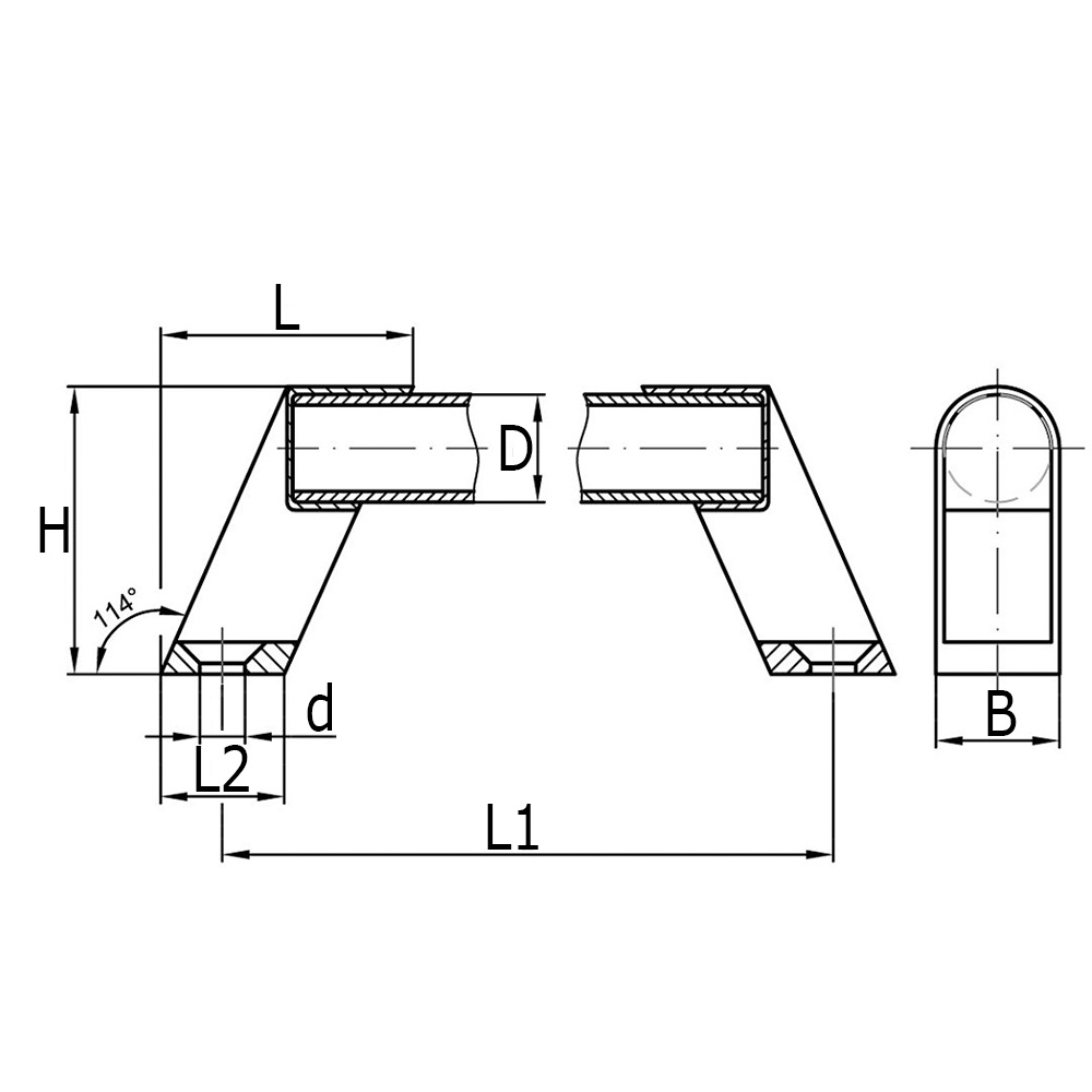 B=Breedte, D=Buis-Ø, d=Boring-Ø, H=Hoogte, L=Lengte eindstuk, L1= Hart op hart maat boringen +/-1mm, L2=Lengte