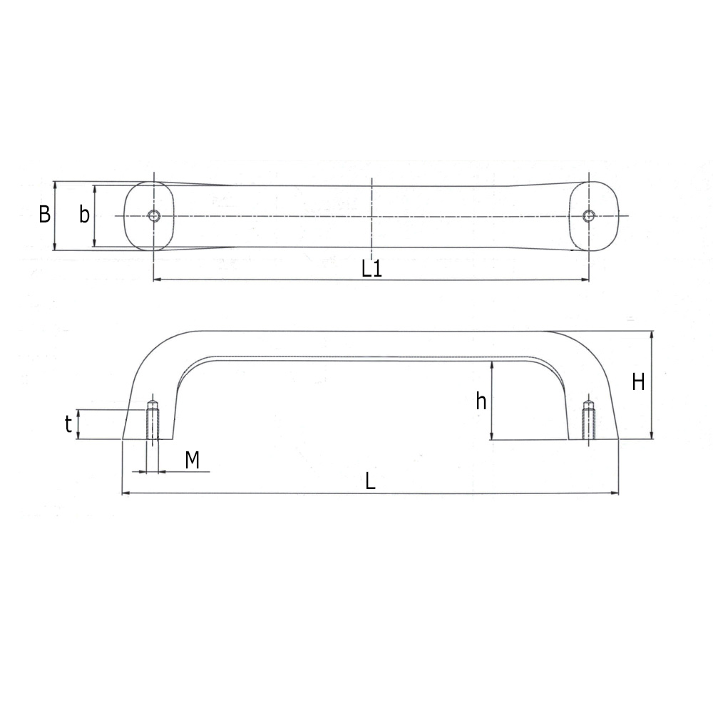 B=Breedte, b=Breedte, H=Hoogte, h=Hoogte, L=Lengte, L1=Hartafstand draadgaten, M=Schroefdraad, t=Diepte