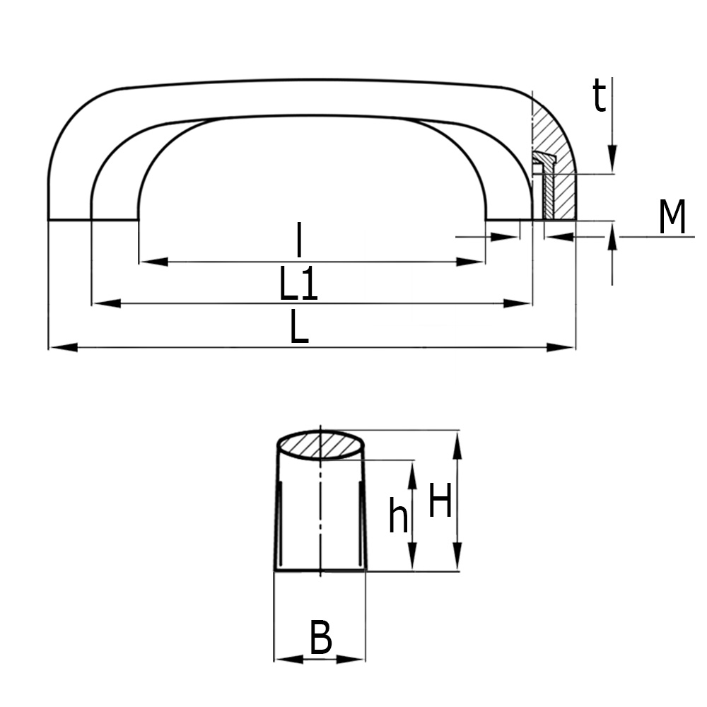 H=Hoogte, h=Hoogte, L=Lengte, L1=Hartafstand draadbussen, l=Lengte, M=Schroefdraad Draadbus
