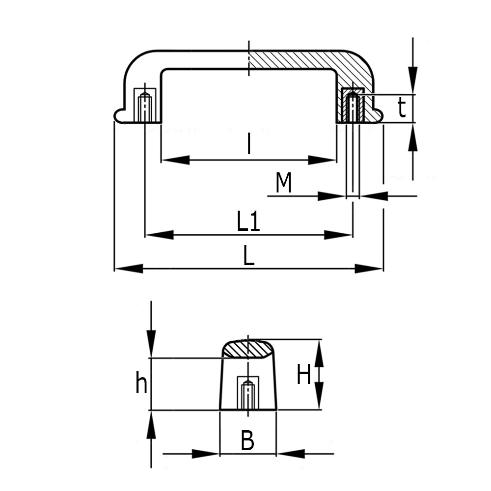 H=Hoogte, h=Hoogte, L=Lengte, L1=Hartafstand draadbussen, l=Lengte, M=Schroefdraad