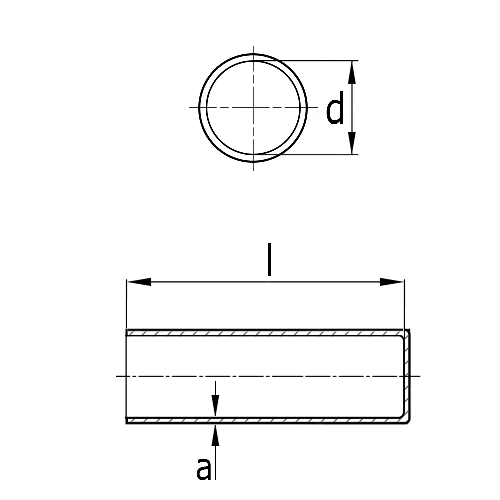 a=Wanddikte, Buisafm.=Uitwendige buis-Ø, d=Inwendige-Ø, l=Lengte dop, Kleur/RAL=Kleur en RAL kleur bij benadering