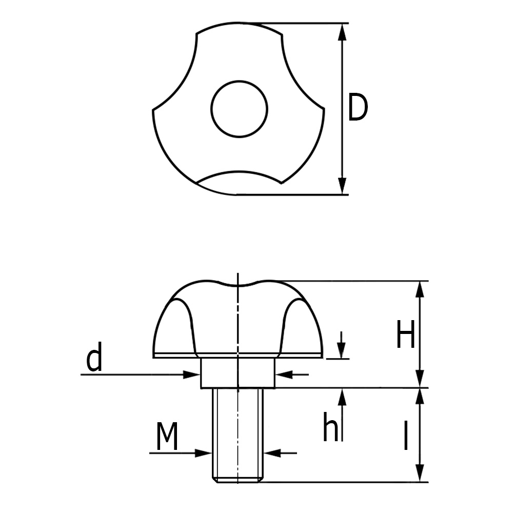 D=Knop-Ø, d=Naaf-Ø, H=Hoogte, h=Hoogte, l=Lengte Schroefdraad, M=Schroefdraad