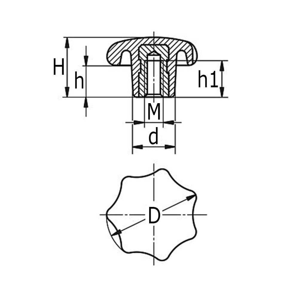 D=Knop-Ø, d=Schaft-Ø, H=Totale hoogte, h=Hoogte, M=Schroefdraad, Type=Materiaal draadbus