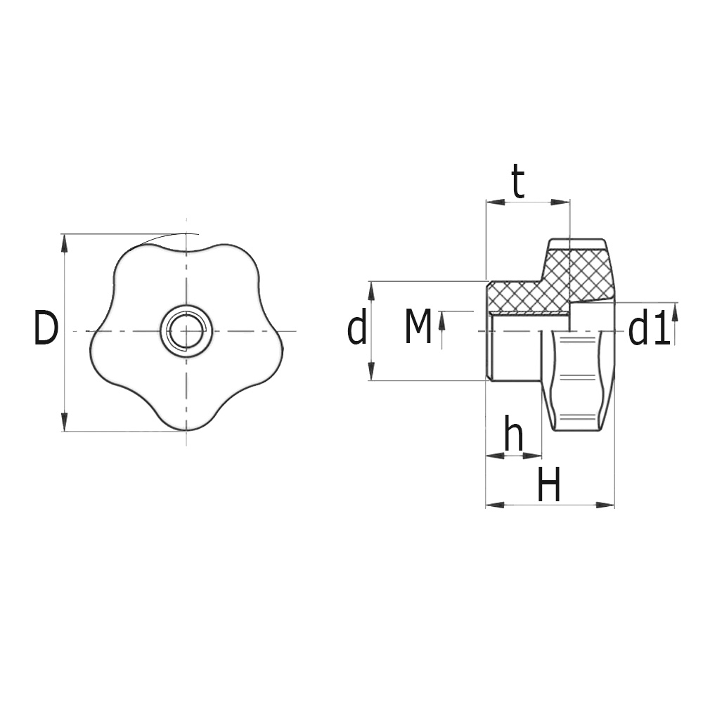 D=Knop-Ø, d=Kraag-Ø, H=Totale hoogte, h=Hoogte kraag, M=Schroefdraad
