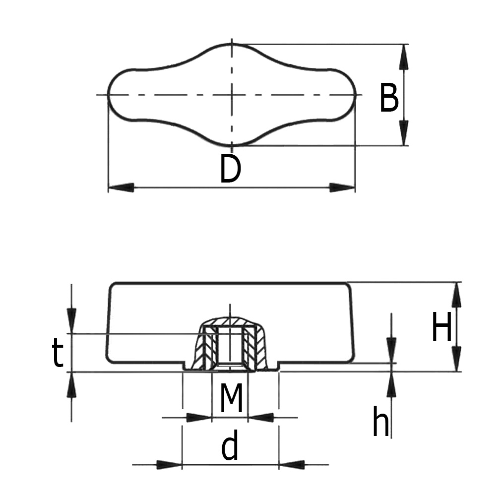 - Kunststof vleugelmoeren, ook wel vleugelknoppen genoemd, met inwendige metalen schroefdraad zijn leverbaar in M4 tot en met M6