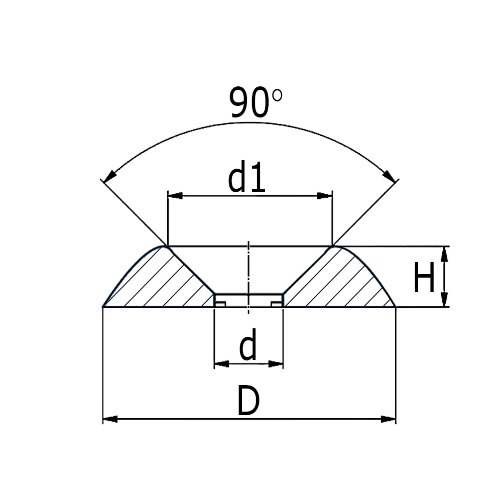 D=Uitwendige-Ø, d=Ø-boring, d1=Boven-Ø, H=Totale hoogte, M=Geschikt voor Metrische schroefdraad