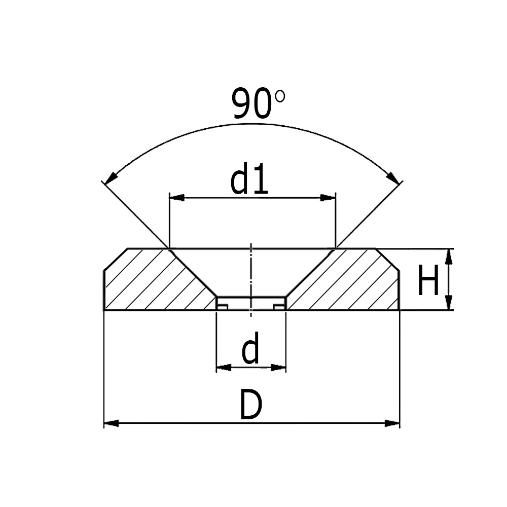 D=Uitwendige-Ø, d=Ø-boring, d1=Boven-Ø, H=Totale hoogte, M=Geschikt voor Metrische schroefdraad