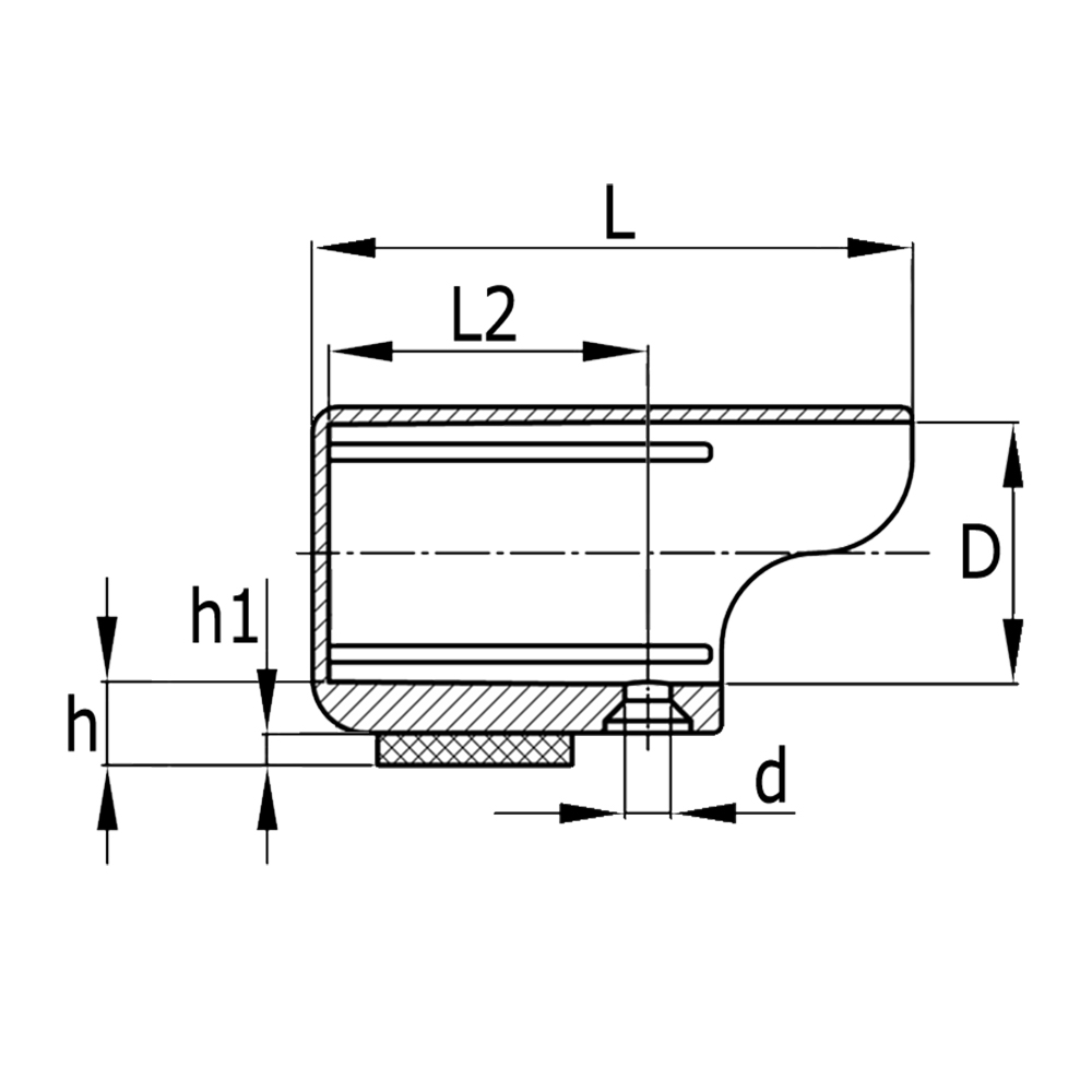 Buisafm.=Uitwendige Buis-Ø, D=Inwendige-Ø, d=Boring-Ø, h=Dikte bodem incl. vilt, h1=Dikte vilt, L=Lengte, L2=Afstand tot boring