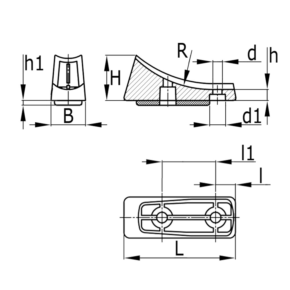 LegendaB=Breedte, Buisafm.=Uitwendige buis-Ø, d=Boring-Ø, d1=Vlakverzonken-Ø, H=Hoogte, h=Hoogte, h1=Viltdikte, L=Totale lengte, l=Afstand tot hart boring, l1= Hartafstand boringen, R=Radius