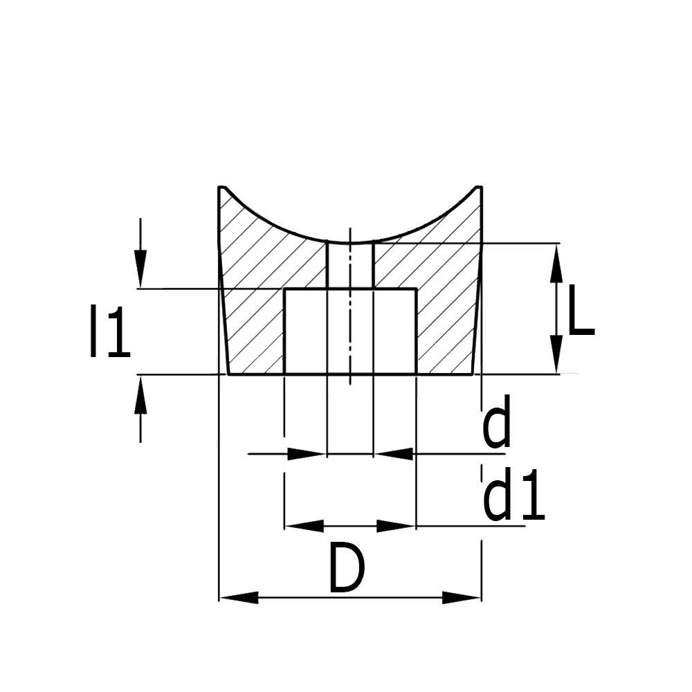 LegendaBuisafm.=Uitwendige buismaat, D=Voet-Ø, d=Boring-Ø, d1=Verzonken gat-Ø, L=Hoogte, l1=Diepte verzonken gat