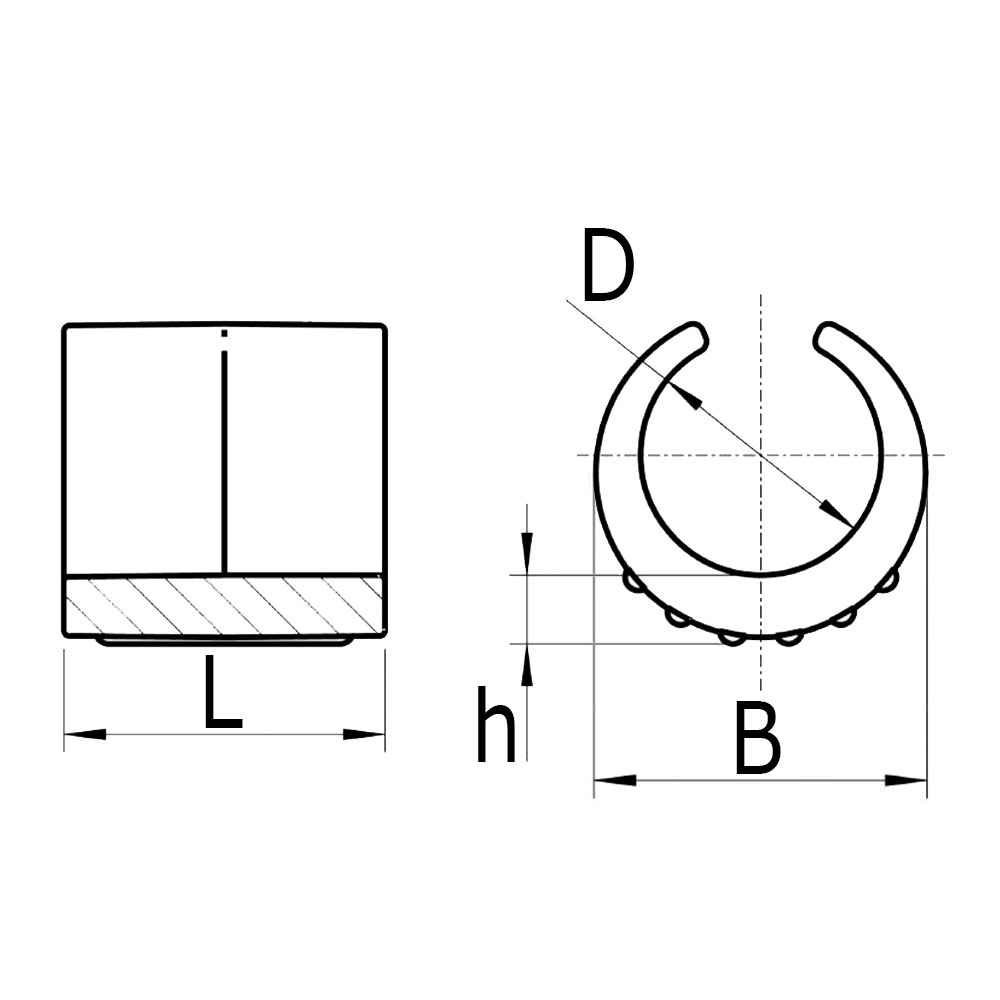 B=Breedte, Buisafm=Uitwendige buis-Ø, h=Dikte voet, L=Lengte