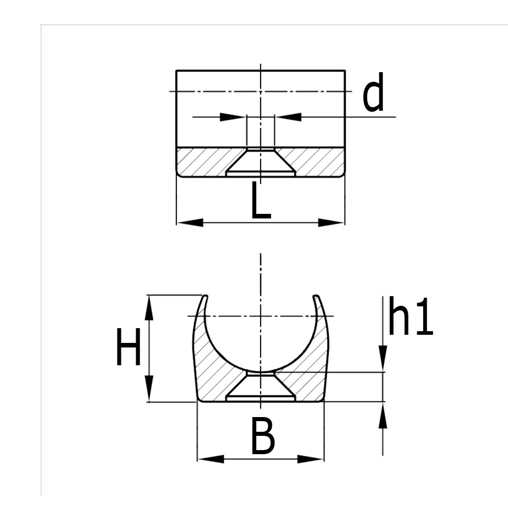 Buisafm.=Uitwendige buis-Ø, B=Breedte voet, d=Boring-Ø, H=Totale hoogte, h1=Dikte voet, L=Lengte voet, Type=Uitvoering