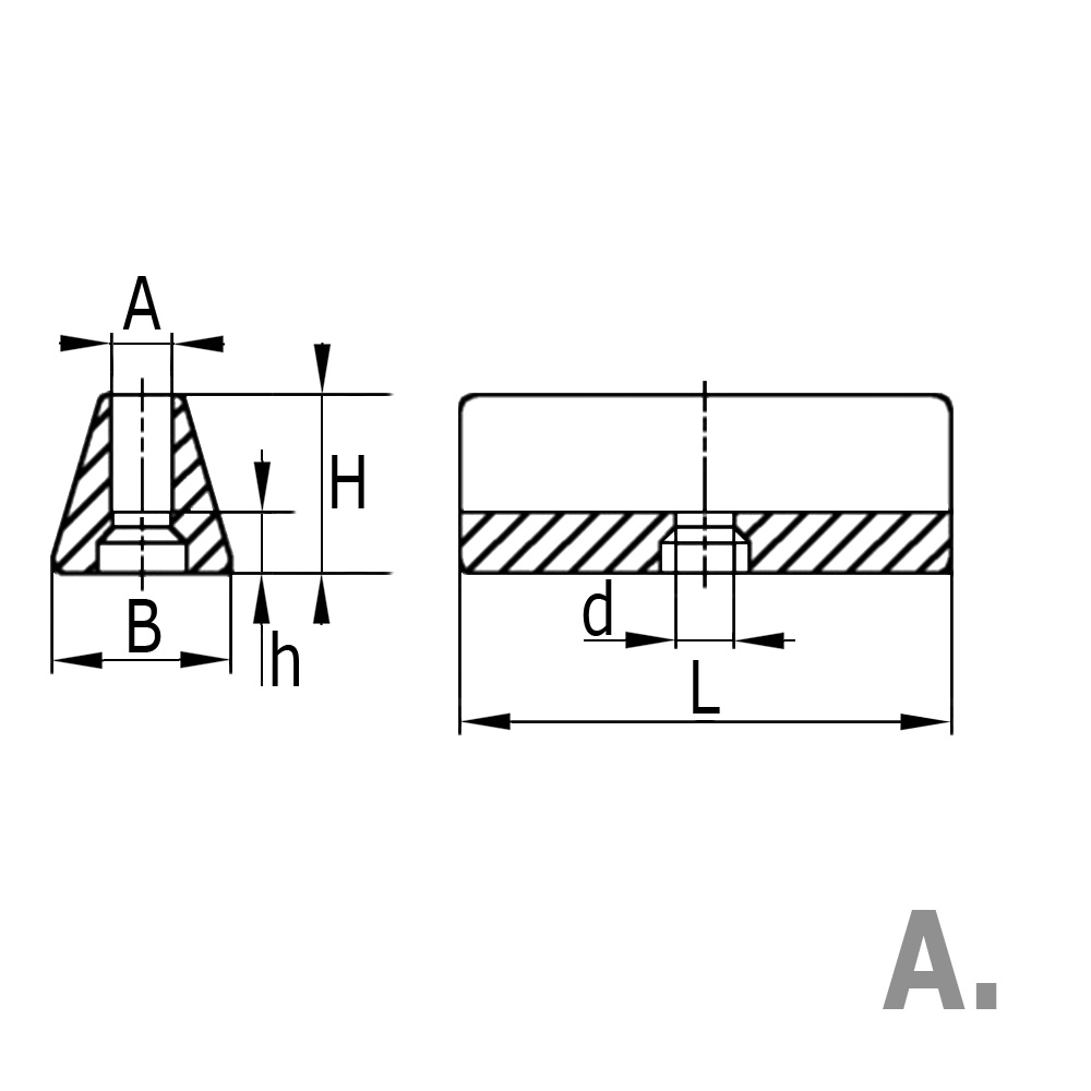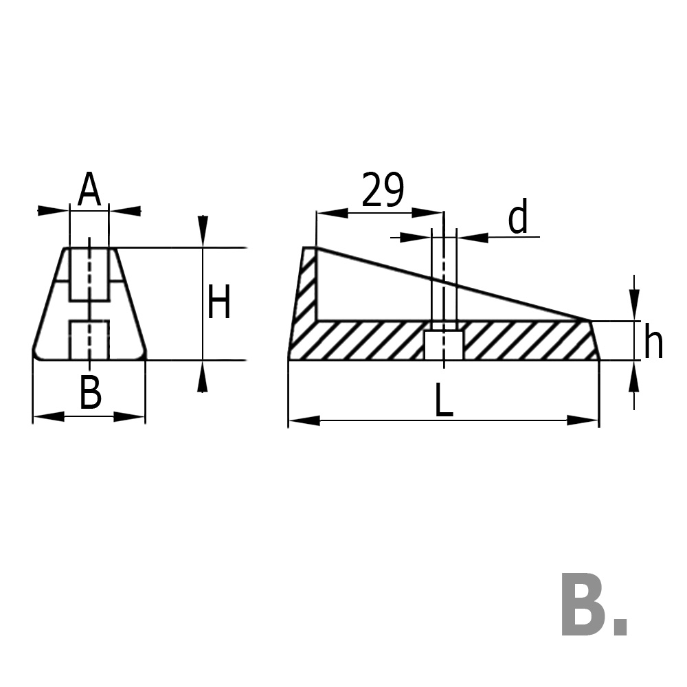 A=Plaatdikte, B=Breedte voet, d=Boring-Ø, H=Totale hoogte, h=Dikte glijvlak, L=Lengte Voet, Plaatdikte.=Plaat- of materiaaldikte, Type=Uitvoering