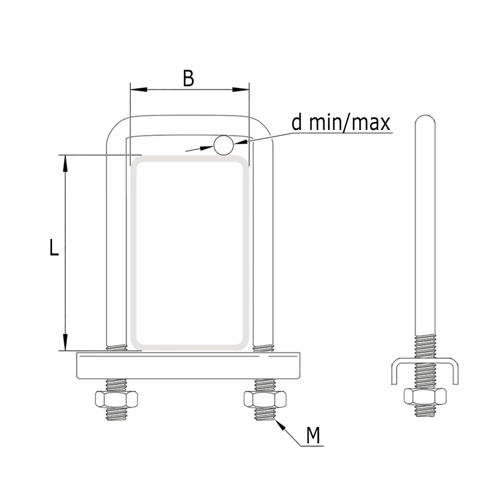 Buismaat=Kokermaat hekwerkpaal, d-min/max=Klembereik staafmat draad-Ø, M=Schroefdraadmaat, Type=Type moer