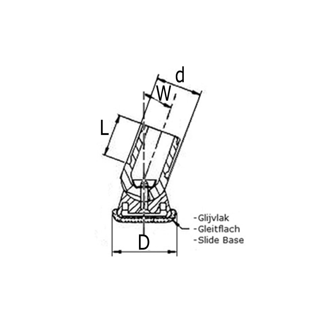 Buisafmeting=Uitwendige buismaat, D=Voet-Ø, d=Kraag-Ø, L=Schaftlengte, Uitv=Wanddikte buis, W=Maximale standhoek in °
