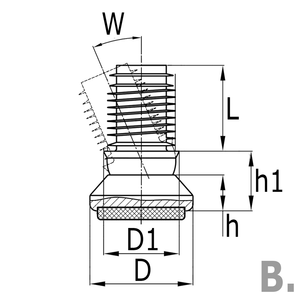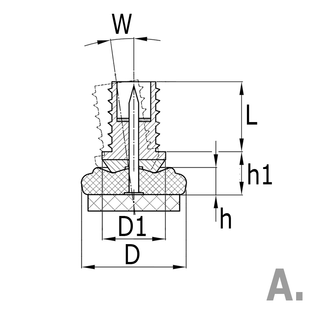 Buisafmeting=Uitwendige buismaat, D=Voet-Ø, D1=Kraag-Ø, h=Hoogte voet, h1=Hoogte kogelgewricht +voet, L=Schaftlengte, Type=Type gewricht, Uitv=Wanddikte buis, W=Maximale standhoek in °