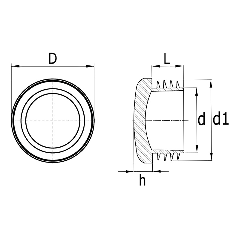 Buisafmeting=Uitwendige buismaat, D=Kop-Ø, d=Schaft-Ø, d1=Lamellen-Ø, h=Kophoogte, L=Schaftlengte, Type=Uitvoering dop, Uitv=Wanddikte buis