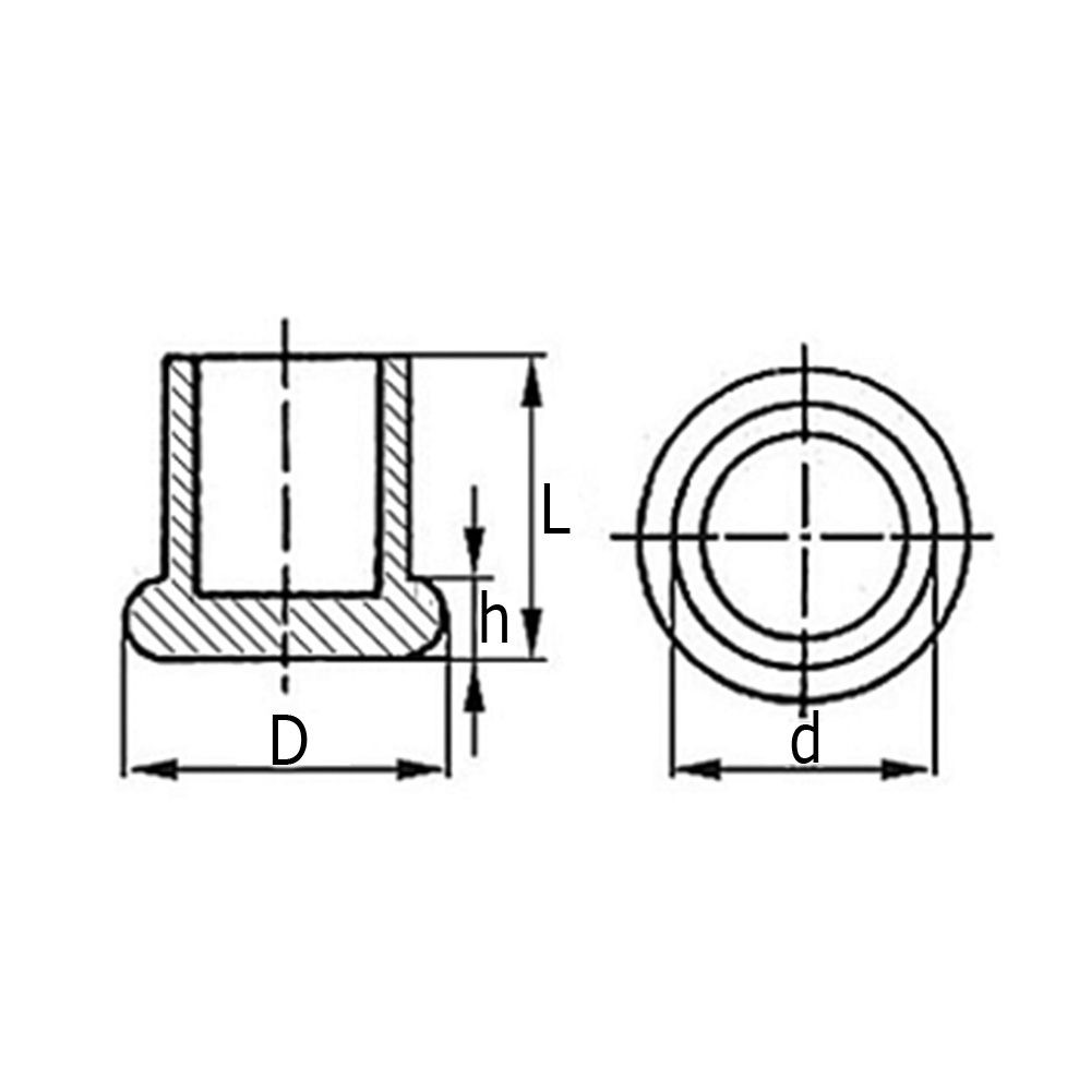 d=Schaft-Ø, D=Kop-Ø, Buismaat=Inwendige buismaat, h=Hoogte kop, L=Totale hoogte