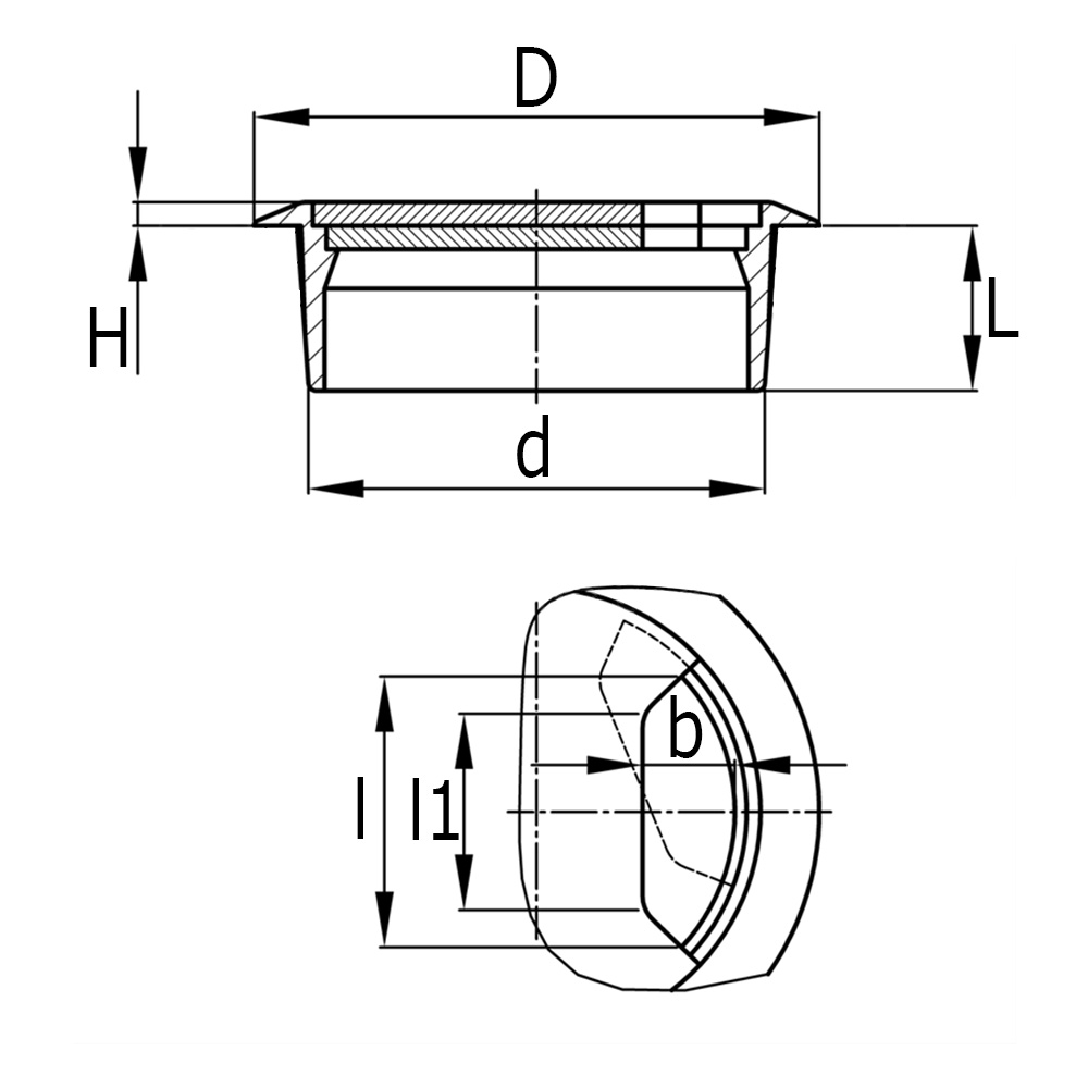 a=Breedte doorvoergat, Boring=Ø-montagegat, b= Breedte doorvoergat, c= Lengte doorvoergat, D=Ø-Kop, d=Ø-Schacht, H=Kophoogte, L=Schachtlengte