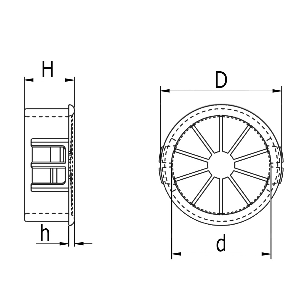 Boring=Ø-Montagegat in mm, D=Ø-uitwendig rand, d=Ø-doorvoer, H=Totale hoogte, h=Randdikte, Plaatdikte=Maximale plaatdikte in mm