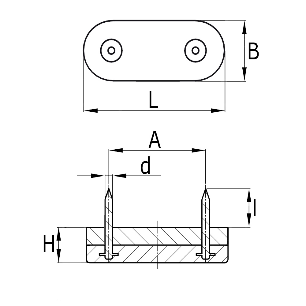 A=Hartafstand nagels, B=Breedte voet, d=Nagel-Ø, H=Dikte voet, L=Lengte voet, l=Lengte nagel
