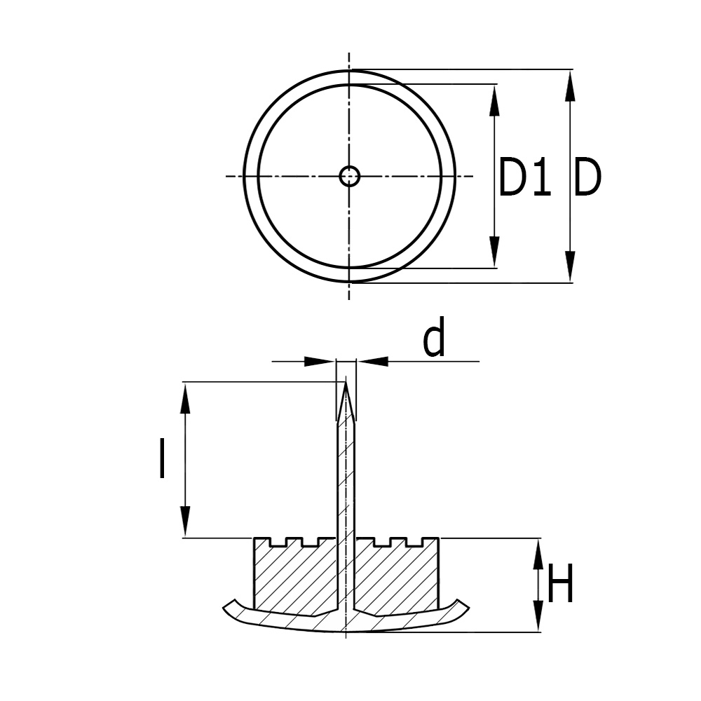 D=Glijvlak-Ø, d=Nagel-Ø, H=Hoogte, l=Lengte nagel