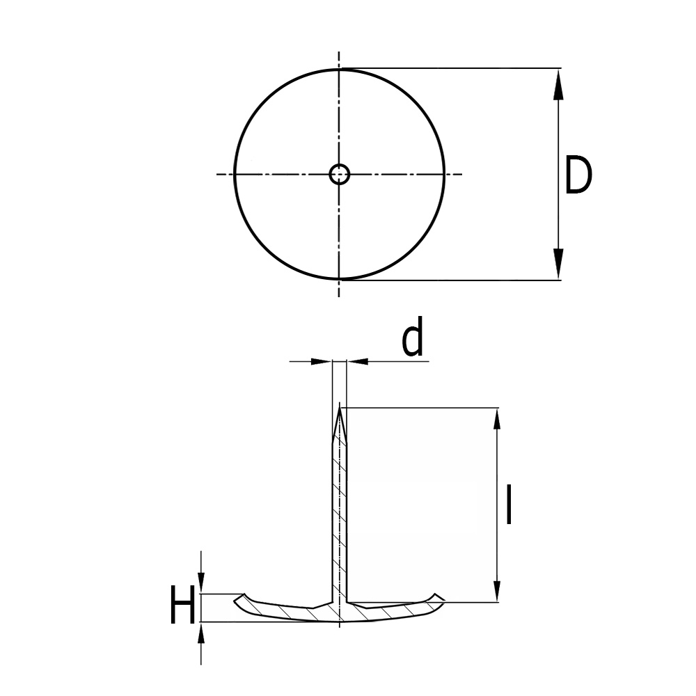 D=Glijvlak-Ø, d=Schroef-Ø, H=Hoogte, l=Lengte nagel