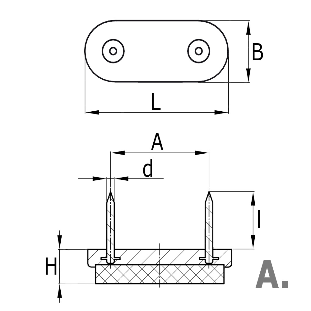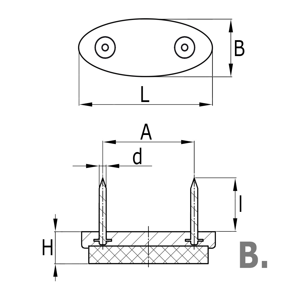A=Hartafstand nagels, B=Breedte voet, d=Nagel-Ø, H=Dikte voet, L=Lengte voet, l=Lengte nagel