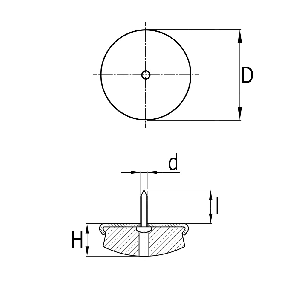 D=Glijvlak-Ø, d=Schroef-Ø, H=Hoogte, l=Lengte schroef