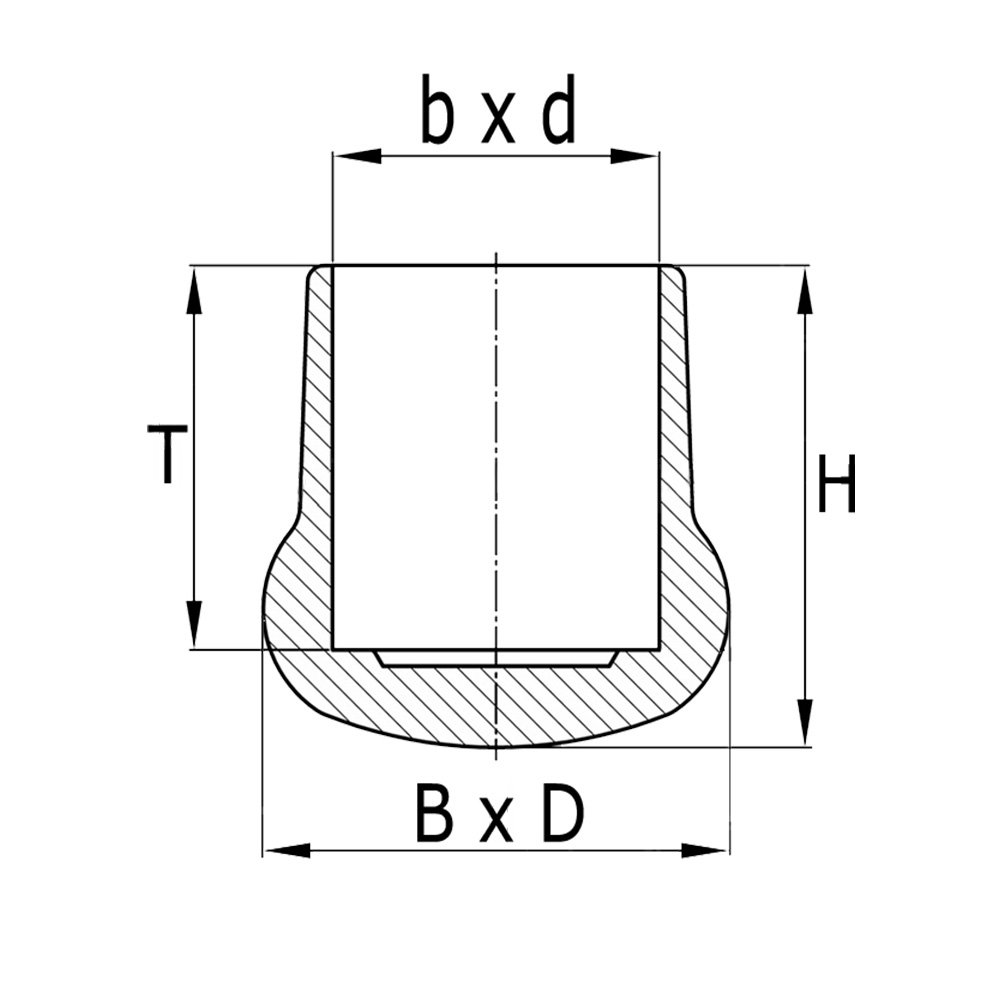 Buisafm.=Uitwendige buismaat, B x D=Uitwendige dopmaten, b x d=Inwendig maten, H=Hoogte, t=Diepte