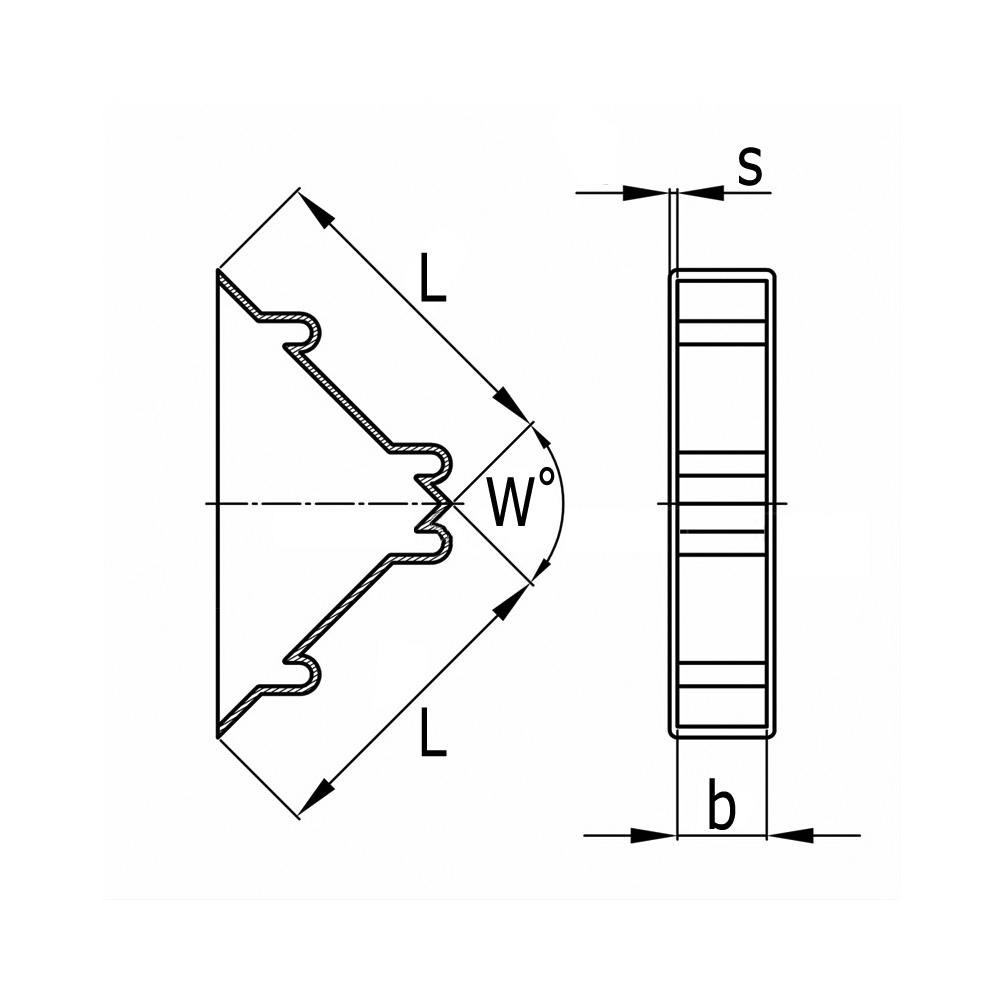 b=plaatdikte, Plaatdikte=b=Plaatdiktebereik, L=Lengte, s=Materiaaldikte, W=Hoek in°
