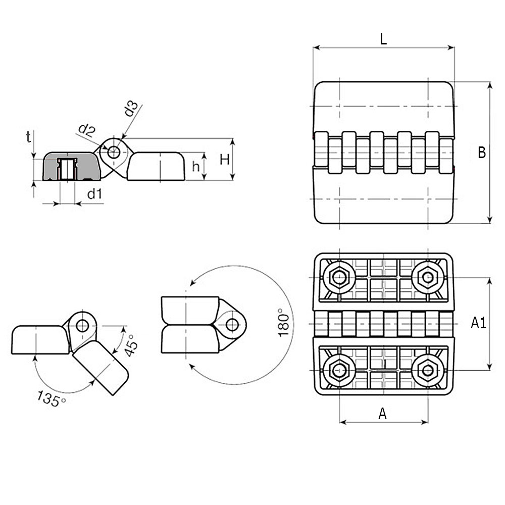 A=Lengte, B=Breedte, C=HoH-maat draadbussen, d2=Ø-scharnierpin, d3=Ø-scharnier, H=Hoogte, h=hoogte, l=HoH-maat draadbussen, M=Schroefdraadmaat draadbus, t=Draaddiepte