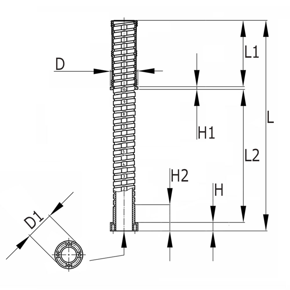 Buisafm.=Uitwendige buismaten, D=Kraag-Ø, D1=Voet-Ø, H=Voethoogte, H1=Kraagdikte, H2=Min. hoogte bij ingedraaide spindel, K=Maximaal statisch draagvermogen in kg, L=Totale lengte, L1=Schaftlengte, L2=Verstelbereik, Uitv.=Wanddikte