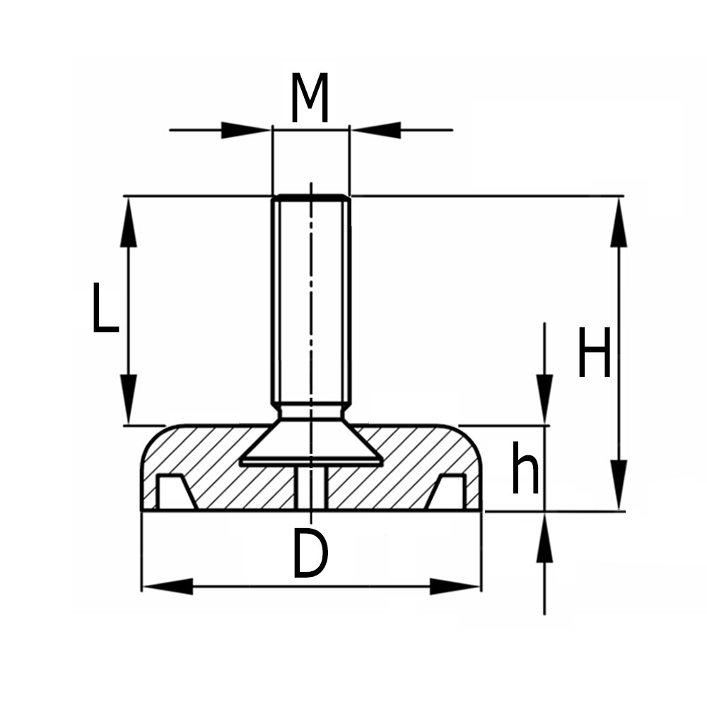 D=Voet-Ø, H=Voethoogte, L= Effectief bruikbare draadlengte, M=Boutmaat