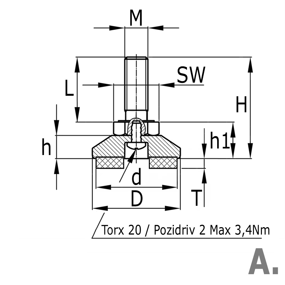 Materiaal: Voet - PE (Polyethyleen) + EPDM (Ethyleen–Propyleen–DieenMonomeer) Shore A 55°, Draadspindel – (DIN 558-4.6-A2F) Staal verzinkt