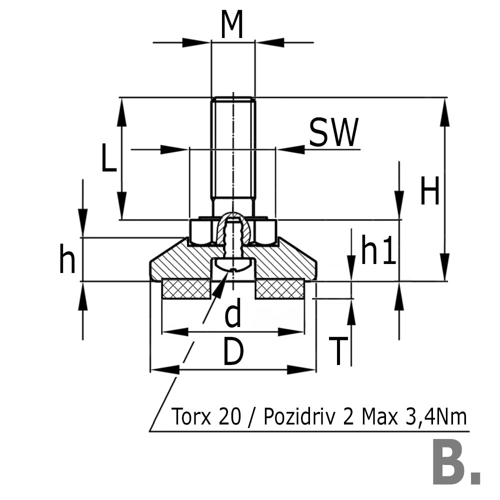 - Kruiskop in voet (Pozidrive 2 / Torx T20) voor eenvoudig machinaal indraaien (max.koppel 3,4 Nm)