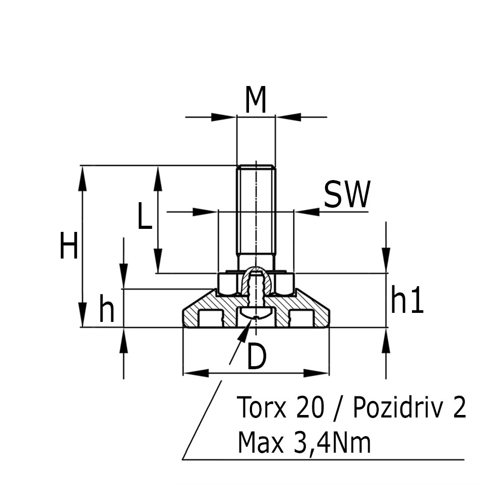 LegendaD=Voet-Ø, H= Hoogte voet + zeskant, K=Maximale statische belasting in kg, L=Draadlengte, M=Draad, SW=Sleutelwijdte zeskant