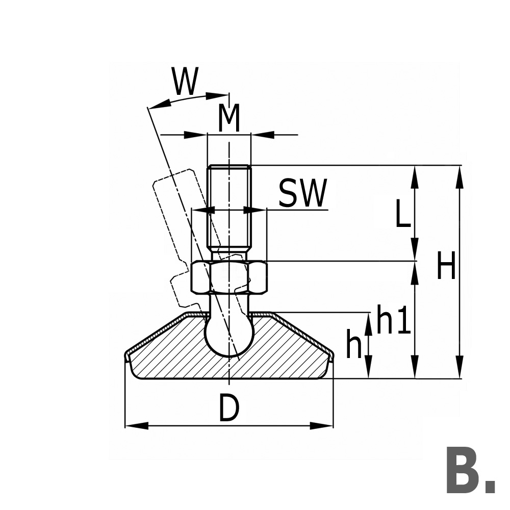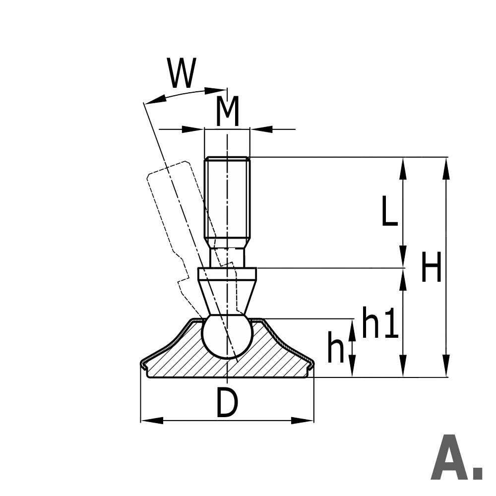 D=Voet-Ø, h=Hoogte, h1=Voethoogte L=Spindellengte, M=Schroefdraad spindel, Mat.=Materiaal, Type=Uitvoering, Uitv.=Vernikkeld/Verchroomd, W=Maximale hoekverstelling in graden